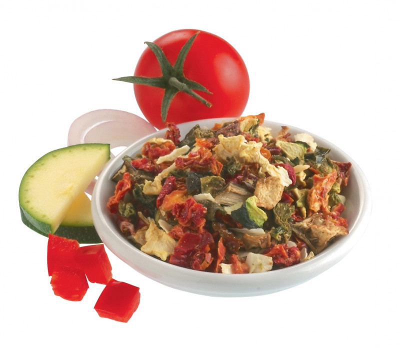 Mélange de légumes séchés. Poivrons, tomates, oignons, courgettes et aubergines.